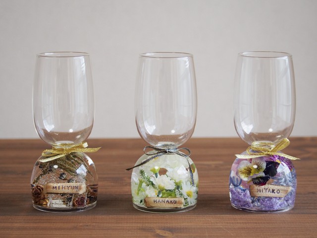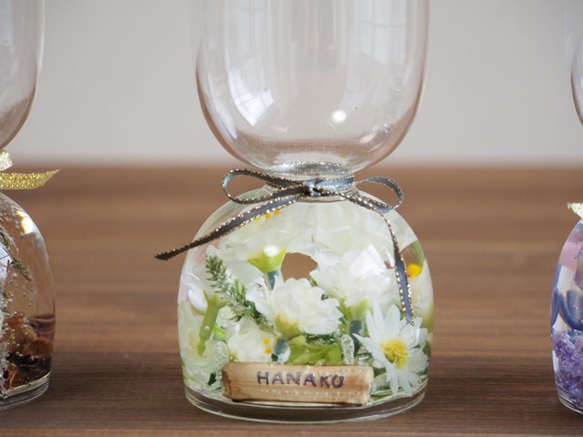 お花をぎゅっと閉じ込めたオリジナル花瓶を2個(お名前はそれぞれお入れします、誰かとのペアでお使い頂くのにぴったりです)お写真にある3通りのデザインからお好みのものをお選び頂けます。