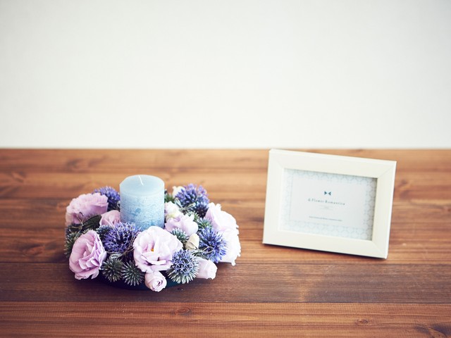 ※上記写真 下:トルコキキョウが主役のテーブルリース&キャンドル(キャンドルだけで飾ってもGOOD♪)をセットでお届け