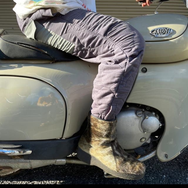 バイクに乗るときは裾を絞ってブーツにインするとシルエットもスマートに。