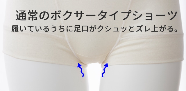 1分丈ショーツでも長時間はいていると、足の間のところで生地がクシュッとズレ上がりますが、ご提案のストレッチシルクショーツは、ズレ上がりにくい設計になっています。