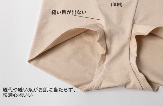 足口にぐるっと縫い目が出ている商品が多い中、ご提案のストレッチシルクショーツは、縫代や縫い糸、テープなどの資材が肌に当たらない縫製になっており、低刺激でお肌にやさしい作りになっています。チクチクするネームタグも生地(肌側)にプリントし、お肌に刺激を与えない仕様になっています。