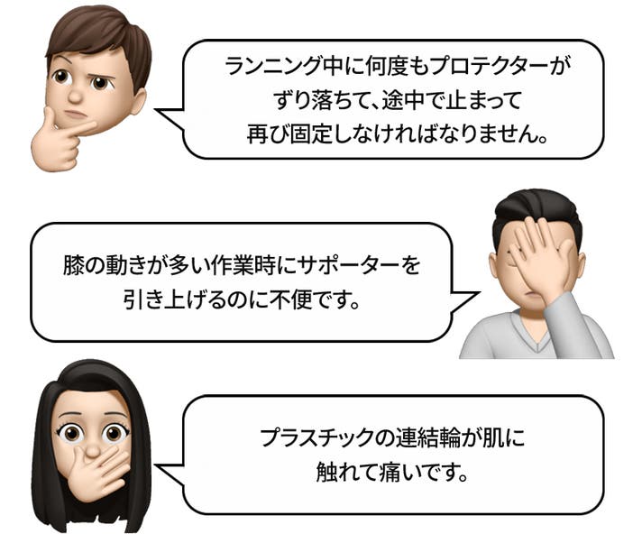 しかし、スポーツ用品店に並ぶサポーターは、どれも大きく厚手なものばかり。 「いかにもサポーターを着けています」という見た目に抵抗があり、また、硬いプラスチック製の金具が肌に当たって痛かったり、蒸れたり……。「もっとスマートに、日常に溶け込むものはないのか?」という不満を抱えていました。