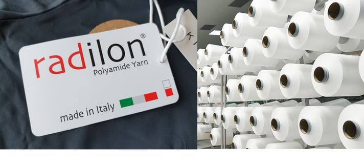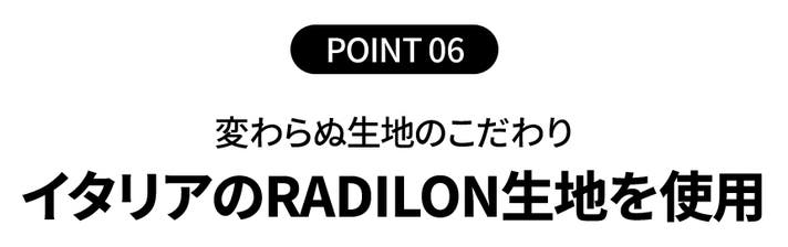 Radilon生地はイタリアカンパニーのRADICHI社が生産するプレミアムナイロン原糸です。 微細なフィラメントで作られるRadilonは、肌との接触に優れた快適さを与えます。ナイロン特有の高い水分吸収容量で水分調節システムの役割をし、快適な状態を維持してくれます。