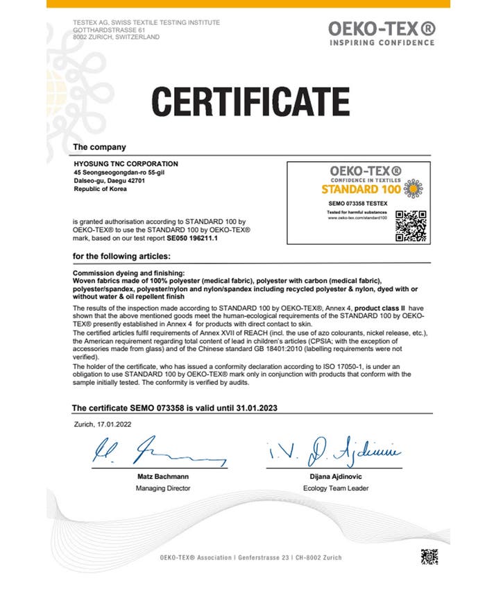 強い耐久性で現存する原糸の中では、様々なスポーツやアクティビティ衣類に最適なポリアミド紡績糸と評価されています。(イタリアプレミアム生地を輸入して韓国生産)