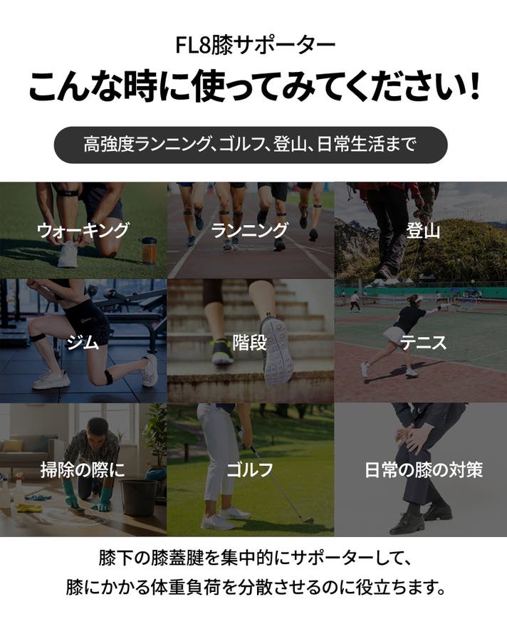 日常生活、スポーツ、階段などの動きで不安定な膝の骨が揺れないように膝蓋腱をを正確な圧迫で不快感を軽減します。