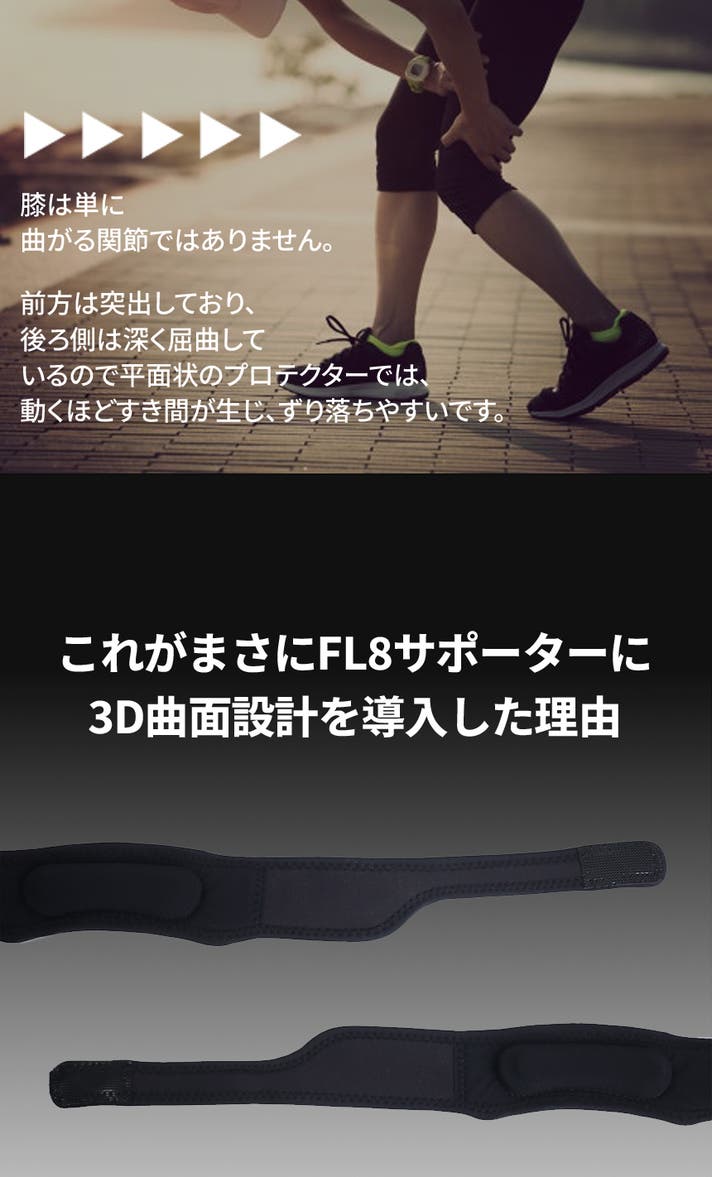 FL8は膝蓋骨の位置と膝の立体曲線に沿って行く3D曲面設計で、着用時に膝の前はしっかりと支持し、後ろの屈曲は柔らかく包み込み、自然に密着します。