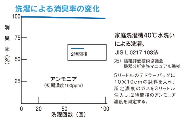 ▼また、家庭用洗濯機で100回洗濯を繰り返しても高い消臭率を維持します。