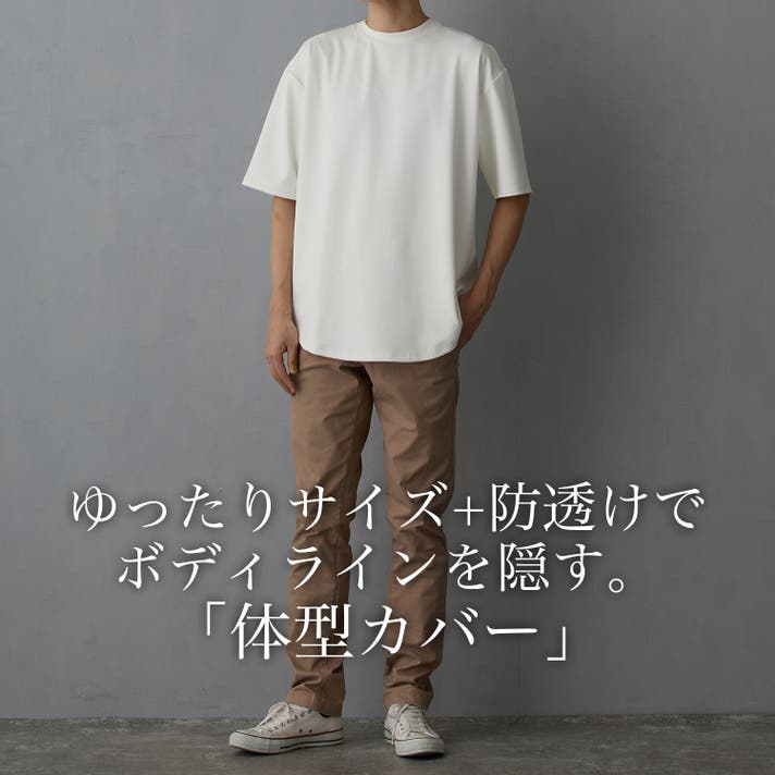 ゆったりサイズで包み込み、防透け機能でボディラインを透けさせないので、ポッコリお腹など、体型の気になる部分を隠し、男性・女性問わずスマートな印象の外観で着用いただけます。