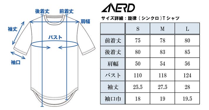 一般的なメンズのMサイズに比べてかなりゆったり。気軽なオーバーサイズで楽しんでいただける「旋律Tシャツ」の基本サイズです。