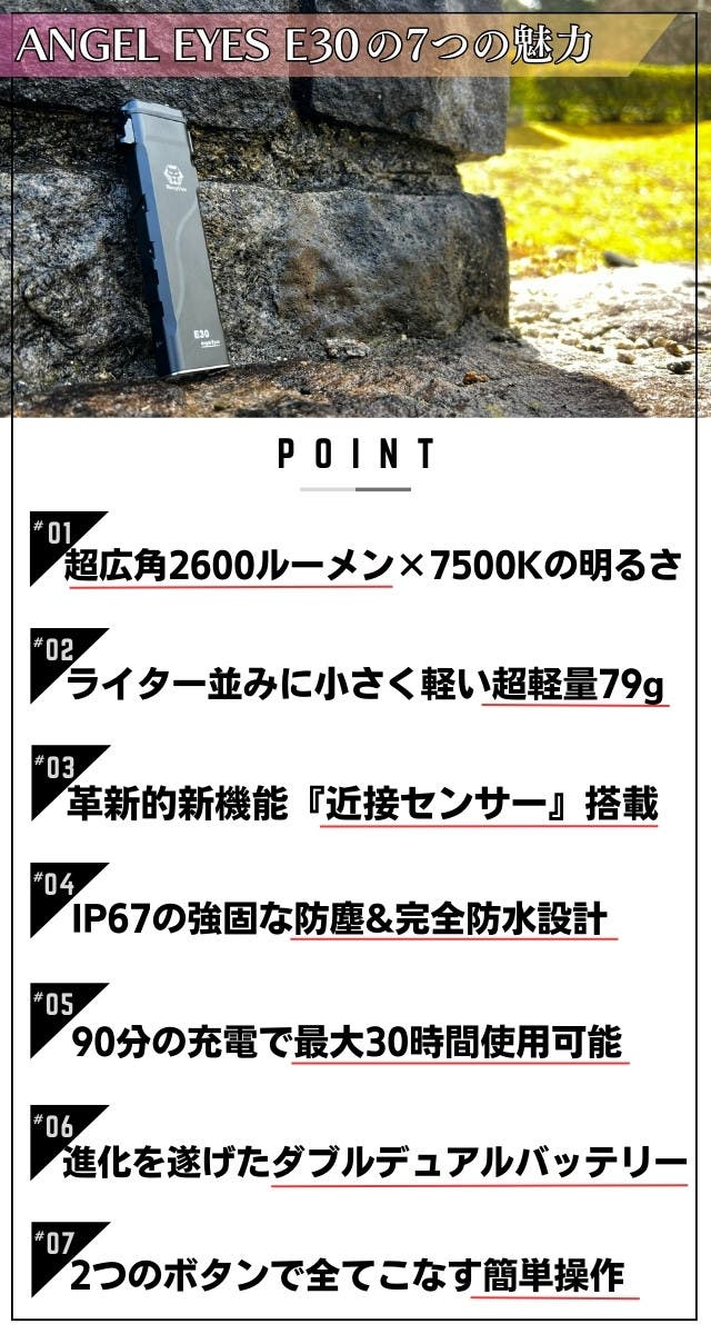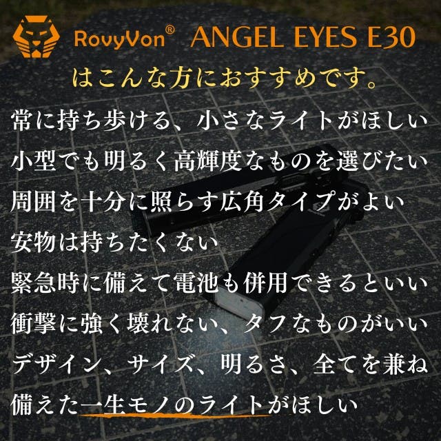 前回プロジェクトE3Plusの利便性はそのままに、その明るさ、機能性、デザインなど、ほぼすべてを大きく進化させた『ANGEL EYES E30』は、ROVYVONが誇る今最も新しく美しい小型LED懐中電灯です。