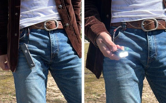 ジーンズのベルトループに通せば夜の散歩も安心です。