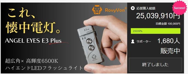 Makuakeにおいて、懐中電灯の応援購入額で歴代No.1を記録した前回プロジェクト「ROVYVON E3Plus」(✳︎2024年4月2日時点自社調べ)