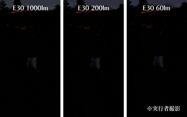 人が感じる明るさは光量と光の広角性とのバランスで決まります。広域に光が届くE30は数字以上に視界が明るく感じられる点が魅力です。