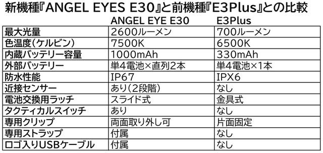 また『E30』は停電時など暗闇で電池交換が必要な場合でも、交換のためにヘッドを開くと自動で内蔵バッテリーに切り替わる、スイッチング機能も備えます。