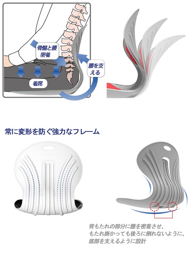 腰を支える効果を最大限に高めるために、背もたれの部分に腰を密着させ、もたれ掛かっても後ろに倒れないように、底部を支えるように設計された製品です。