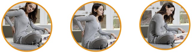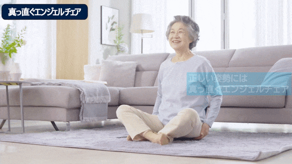 <真っ直ぐエンジェルチェア>を使用する際は、お尻を最大限後部に密着させ、腰を真っ直ぐにした状態で、正しくお座り下さい。