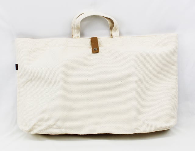 このバッグは、日本における綿織物の発祥地、愛知県三河地区で作られた伝統ある三河木綿を使用した「刺し子織」で作っています。