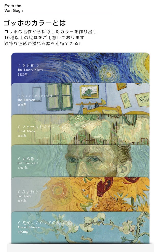 黄色は、見る人を元気にする力があります。今回ご用意する絵具は、ゴッホの名作から採取したカラーを10種以上作り出し、そのうちゴッホのまばゆい黄色はメインカラーになります。