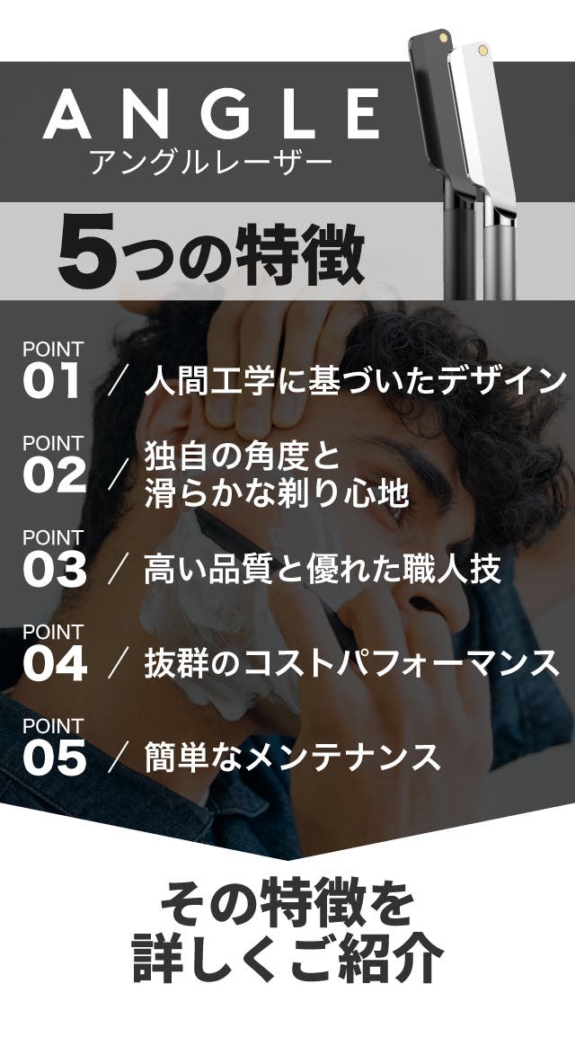 【Angle Razor】は、独自の角度の付いた刃で巧みに設計されており、ヘッドが先細りになっているため、刃が顔に対して完璧な角度で当てられます。