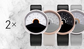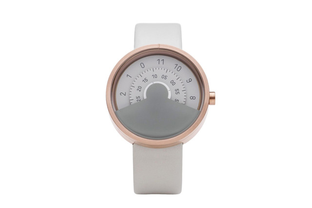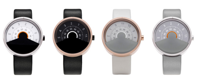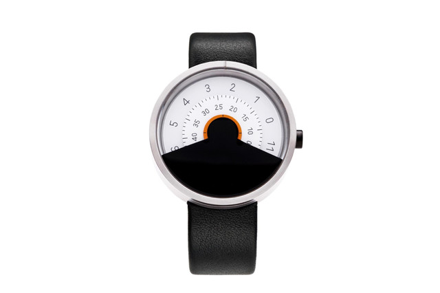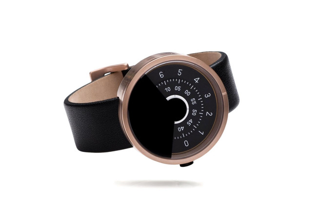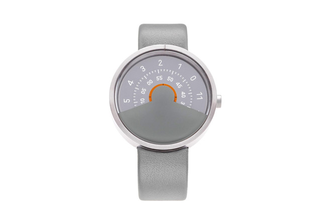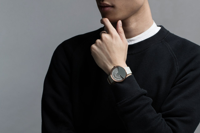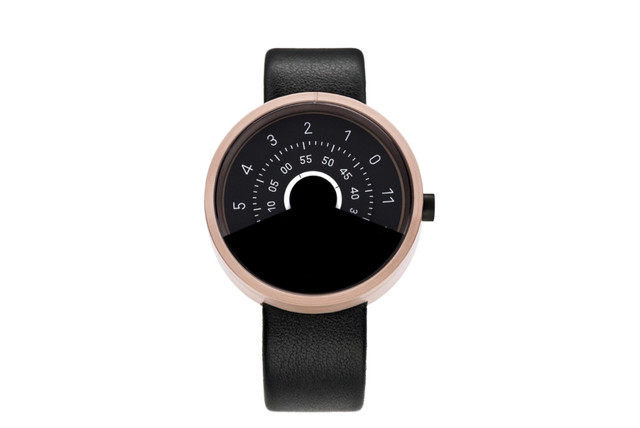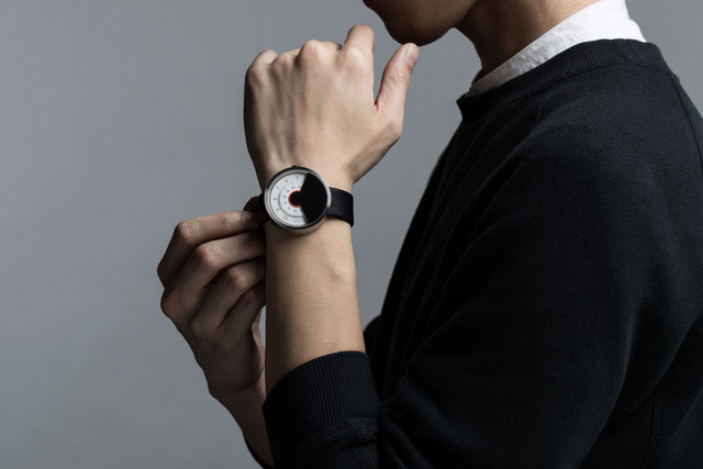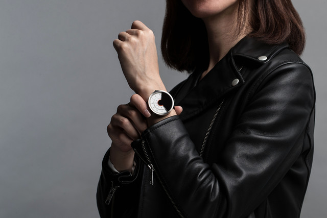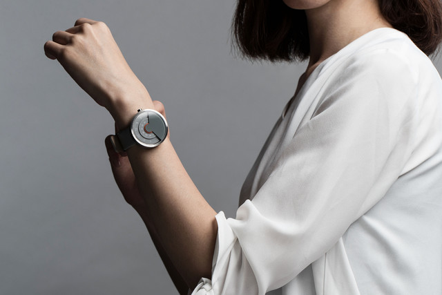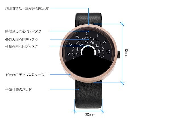アニコーンは独自の「同心円ディスクシステム」を文字盤に搭載。3層のディスク・システムにより回転するディスクから秒、分、時間を垂直に読み取る「針のない時計」をデザインしました。