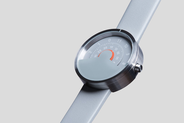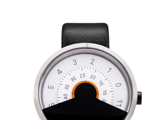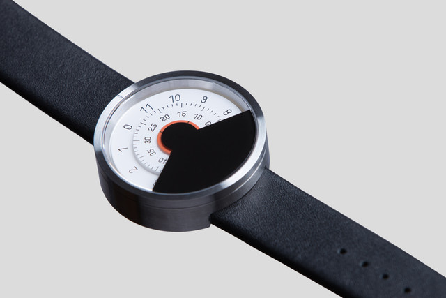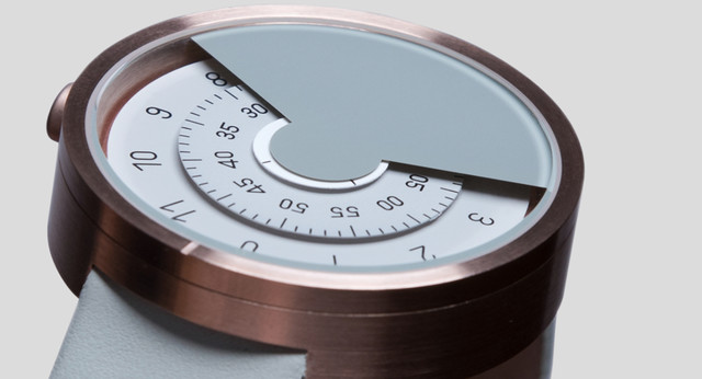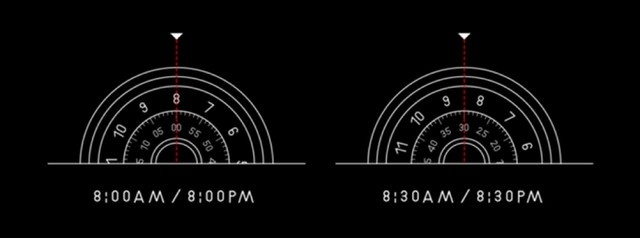 時刻を示す時数と分数は時計回りに刻印されています。3枚の独立した「同心円ディスク」に、外側からそれぞれ時間と分単位の目盛りが刻まれ、最上部中心のディスクには秒が印されています。コンパスで方角を読むのと同じように、最上部に刻まれた印を頂点にし、文字盤に並ぶ数字を一直線に読むことで時刻を知ることができます。