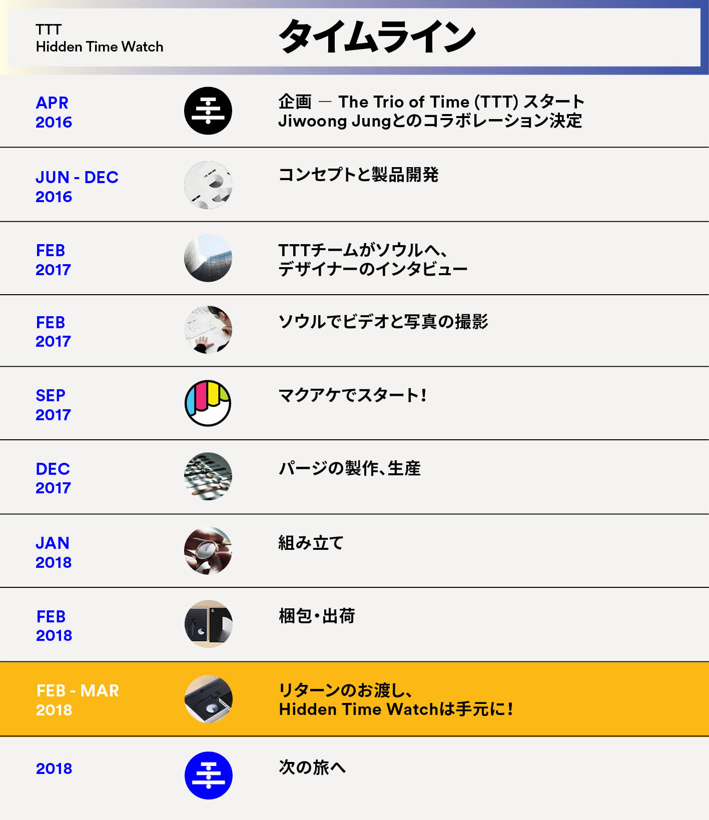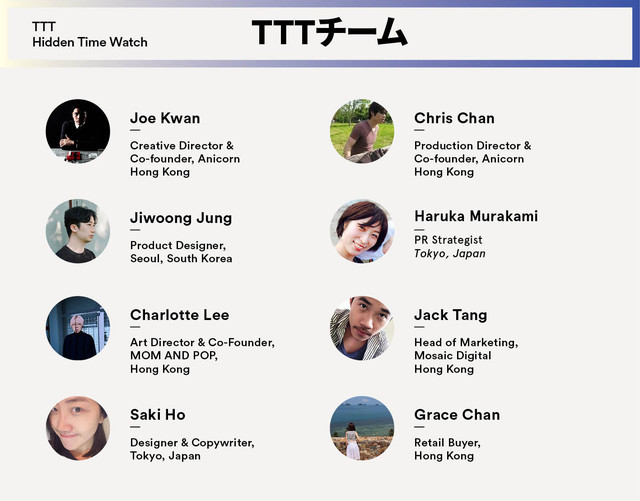 The Trio of Time(トリオ・オブ・タイム:TTT)は、国際的な創造性で時間認識を再解釈する、初の実験的世界ツアー。世界3都市のローカルデザイナーとのコラボレーションで時計を生み出し、日本のみなさんへ向けてMakuakeでリリースします。今後展開されるそれぞれの時計には、過ぎ行く時間に対するデザイナーの視点を反映したユニークなデザインが採用されます。