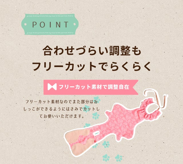 サポーターメーカーだからこそ考える、傷口を舐めにくいベルト構造と肌当たりの良いフリーカット素材を採用し、術後のワンちゃんの傷口を守ります。