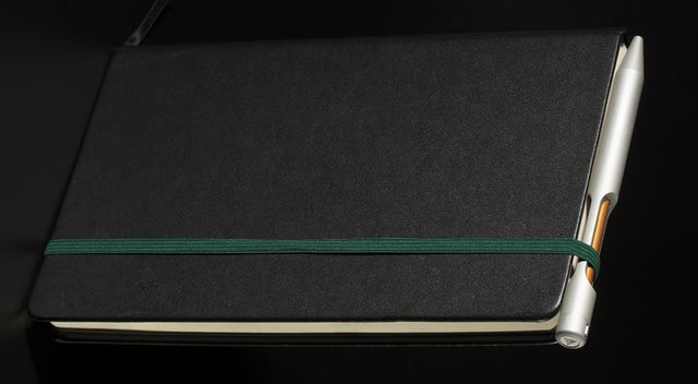 アニマダヴィンチペンは、ペンの本体が大きく削り取られ中軸に触れるという、極めて個性的なデザイン。手帳と一緒に留めるとこのようにスマートに。