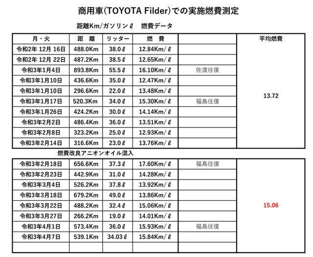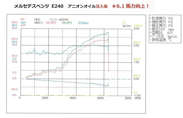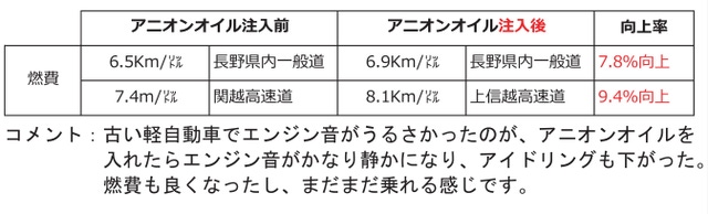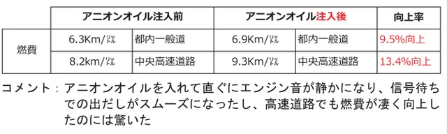アニオンオイルによりエンジン内部がきれいになることから、燃焼効率が良くなり、エンジンの出力が改善し、燃費も向上します。