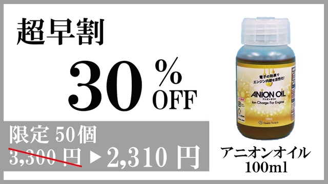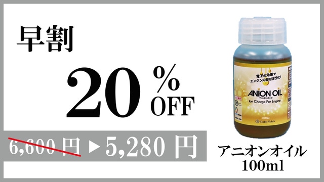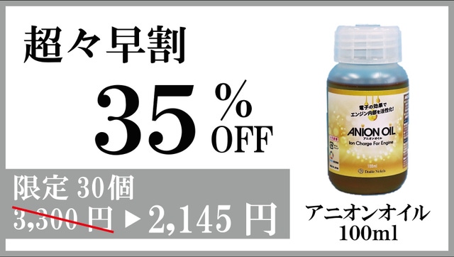 アニオンオイルは一切の添加剤を使用しておらず、独自の手法で高濃度イオンを印加したオイルですので、後にエンジン不調になる事はありません。