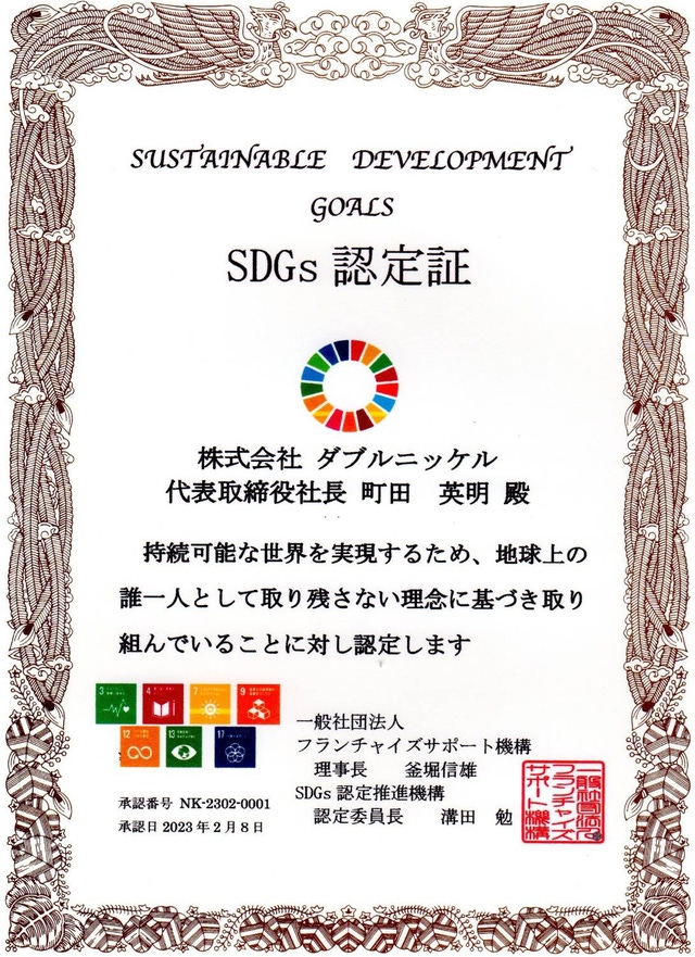 その取り組みが認められ、2023年2月に一般社団法人 フランチャイズサポート機構より、SDGs認定企業に選出されました。