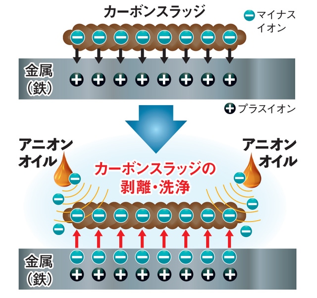 通常、エンジン内部の金属表面はプラスに帯電し、カーボンスラッジがマイナスに帯電しているため、カーボンスラッジは強力に金属表面に密着 しています。