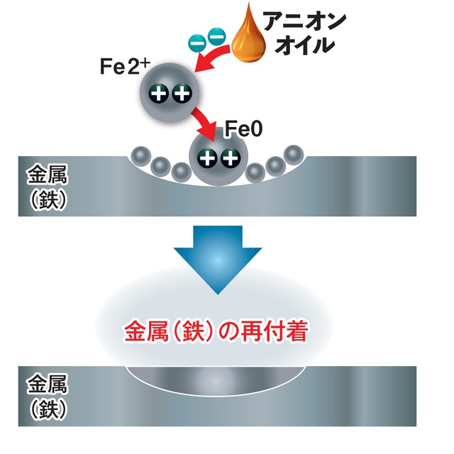 この状態に陰イオンを帯びたオイル(アニオンオイル)が添加すると 、磨耗された微細な金属は単純な金属元素(Fe0)となり鉄の結晶状態になります。