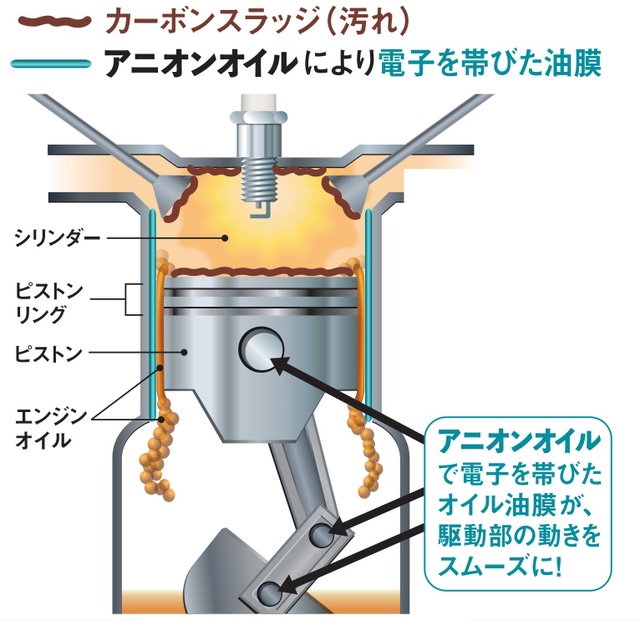 アニオンオイルをエンジンのオイルに追い注入することで、エンジン内のオイルに行き渡りエンジン各部の動きがスムーズになります。