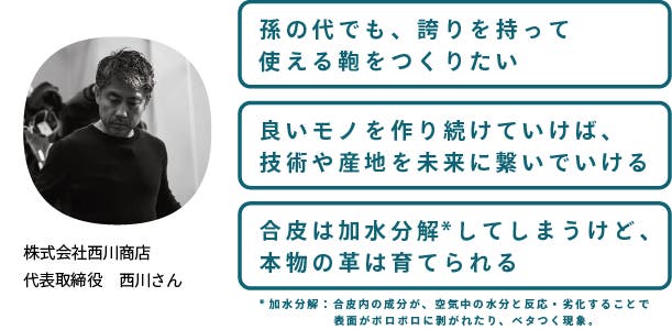 製造を担当した株式会社西川商店の西川さんが語った言葉は、このプロジェクトの姿勢そのものであり、その想いは鞄の細部にまで息づいています。