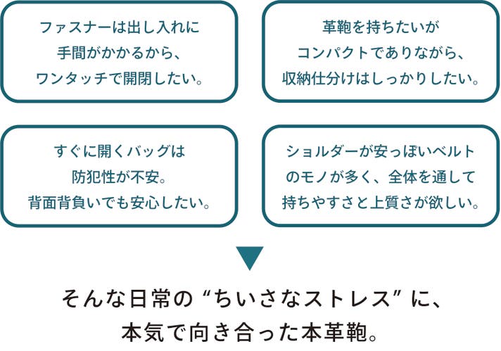 ちょっとそこまでの外出から、身軽に過ごしたいoffの日、会社出勤のonの日まで。身軽さと上質さを持ち合わせているので、年齢,性別を問わずどんな日常にも自然に馴染む。使うたびに手放せなくなる一品です。
