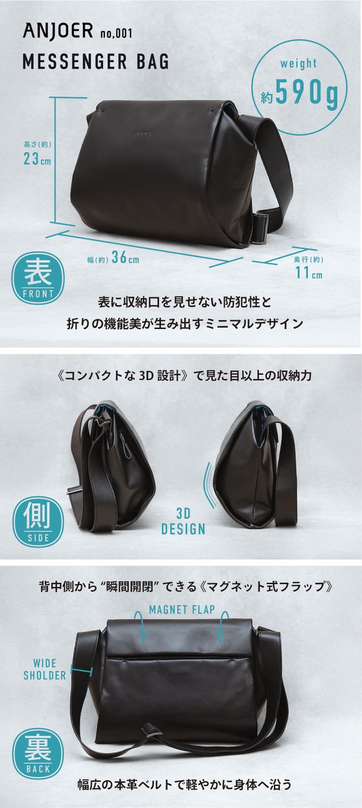 ANJOER(アンジョア) No.001は、日々の不満をひとつずつ丁寧に拾い上げ、職人とデザイナーが“本当に使いやすい形”を追求した新しい定番となる本革メッセンジャーバッグです。機能とデザイン、使い心地と見た目。どれも妥協せず、「毎日持ちたくなる一品」に仕上げました。