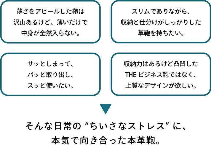 シボ(凹凸)の主張が強い革鞄が市場には多い中、本製品はシボの少ない滑らかな質感を持つ、イタリア産・フルグレインレザーを採用。「隠れた美学」を表現する、暮らしに溶け込む本革の表現を目指しました。