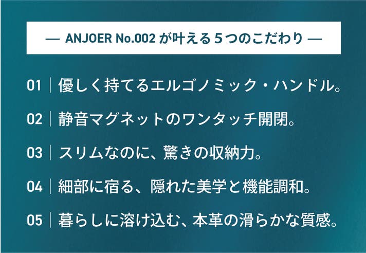 ANJOER No.002は、日々の不満をひとつずつ丁寧に拾い上げ、職人とデザイナーが「本当に使いやすい形」を追求した新しい定番となる本革スリムバッグです。機能とデザイン、使い心地と見た目。どれも妥協せず「毎日持ちたくなる一品」に仕上げました。