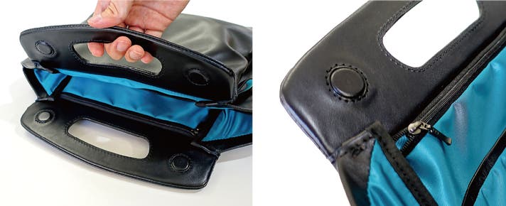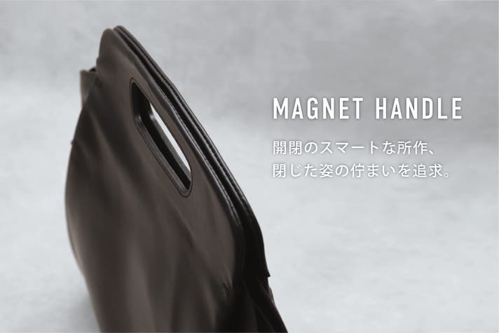 - マグネットハンドルで持ち手が合わさり、持ちやすく瞬時に開閉可能。上質なイタリアンレザーを厳選。