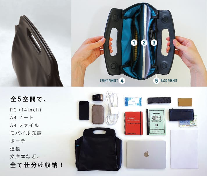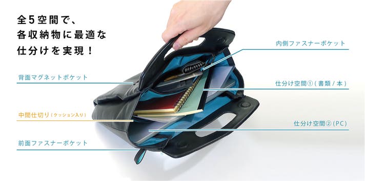 - 薄さと想像以上の収納力を両立、全5空間で瞬間仕分け。14inchPC/A4ファイルも収納可能。