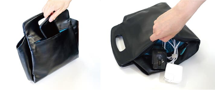 コンパクトながら、マチを設けた立体設計で、作業スペースに自立してガジェットポーチのように使うこともできます。