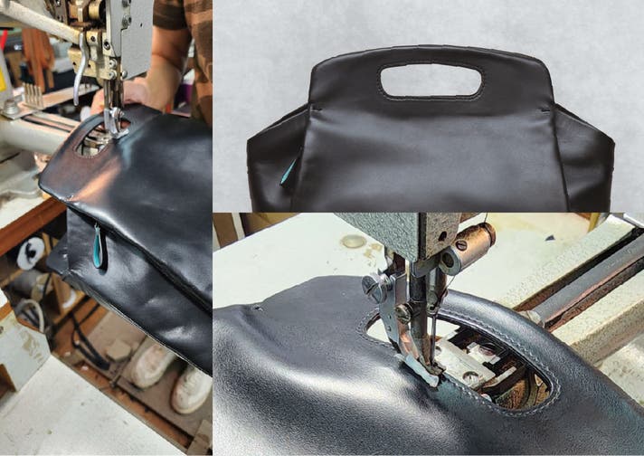 ANJOERのスリムバッグは、鞄全体のシルエットをスリムに保つため、本体のデザインに溶け込むハンドル形状を採用。何度も形状や縫製を検討し、完成したのがデザインと職人技が共鳴しあうエルゴノミック・ハンドルです。