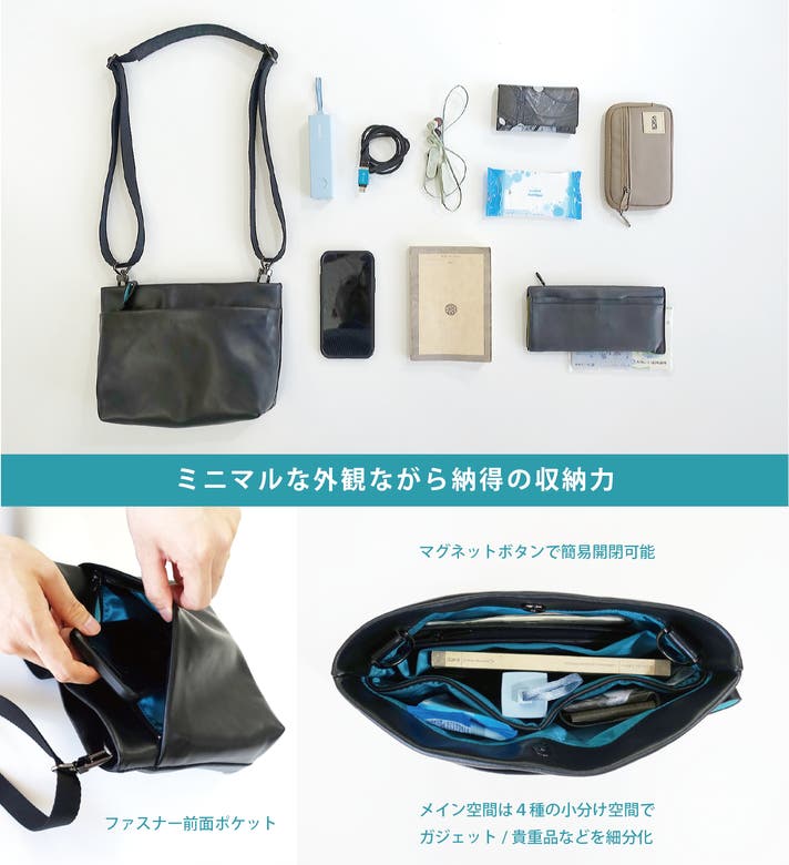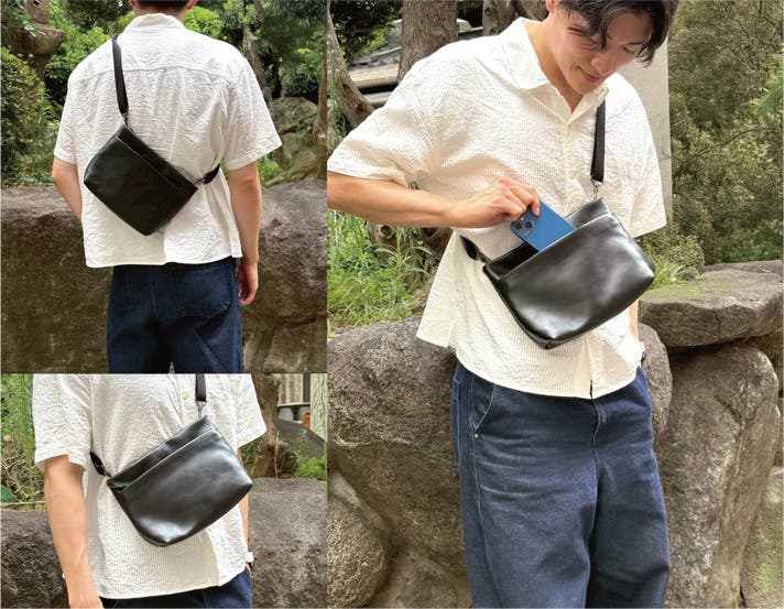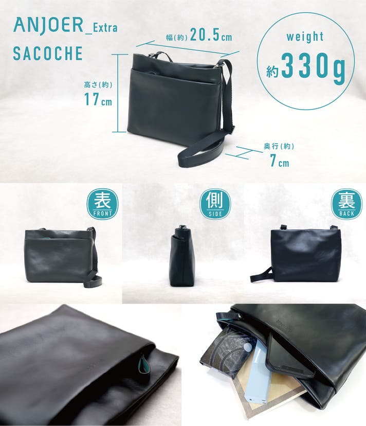 ANJOERシリーズ共通のミニマルなデザインながら、納得の収納力、軽さと上質さも備えた大人ミニマルなサコッシュです。