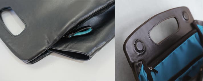 内装の仕切りもハンドルと同様にステッチを表に出さない設計としており、一般的な縫製方法に比べて手間と時間を要しますが、その分、外観の美しさと使い心地の良さを両立させています。