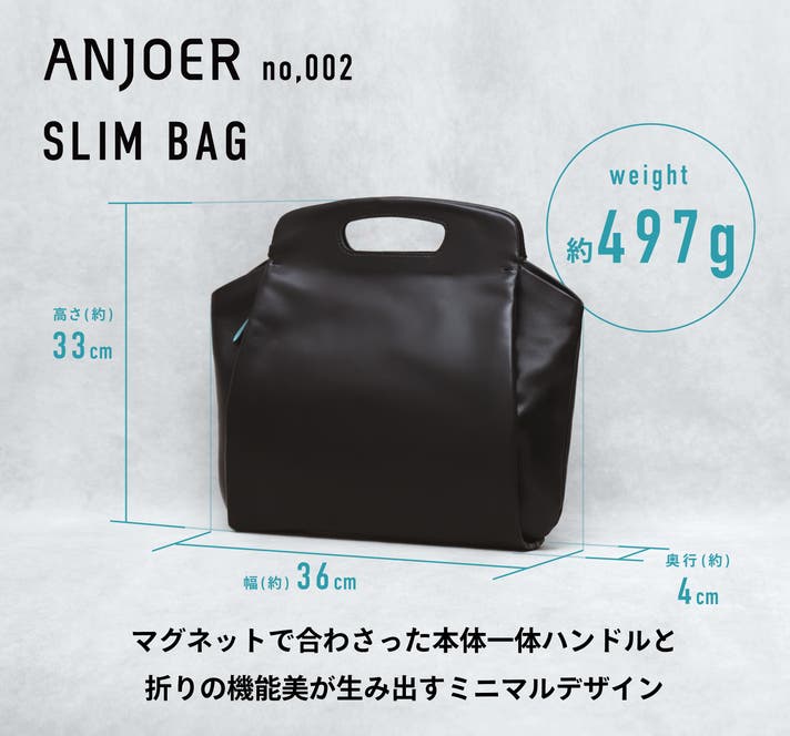 8社の鞄職人と2名のデザイナーにより、大阪発のブランドとして誕生したANJOER。その第二弾製品が、“新しい定番”として設計されたno.002 スリムバッグです。