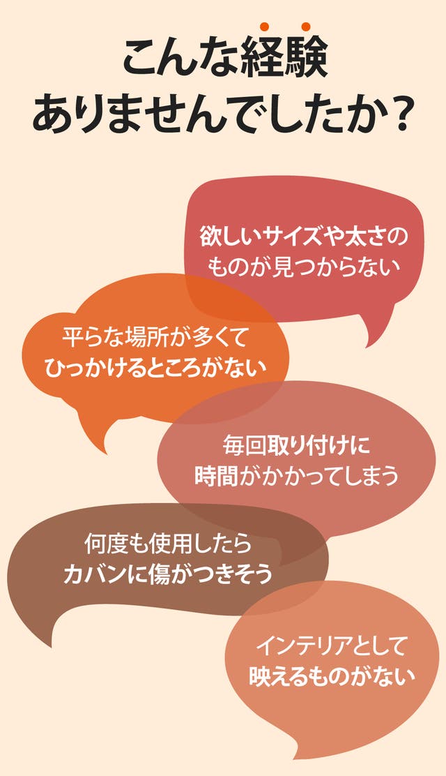 柱や棒にクルッと巻いてカバンや物をかけてもノンスリップなのでピタッとくっつき下に落っこちにくくなっています。 形を変えて好きなところに幅広く使えます。