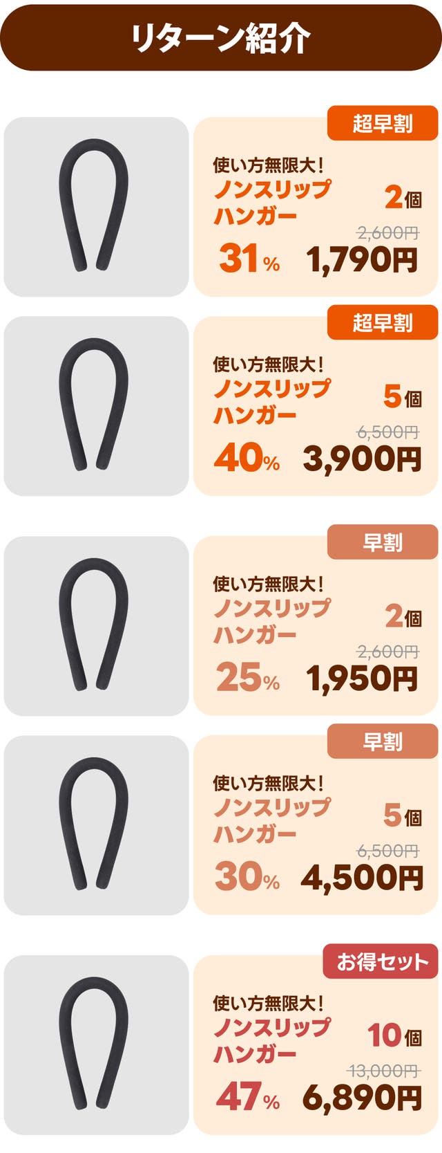 この商品を輸入しようと思った理由:狭いワンルームではどうしても収納スペースが限られてしまいます。色々探し、見つけたのがこのノンスリップハンガーです。ノンスリップハンガーは使い方が無限大で、平らなところにひっかけたり、柱を利用したりしても滑りにくいため重たい荷物も簡単にひっかけられます。みなさんも必要としているのではないかと思い、プロジェクトを進行することになりました。