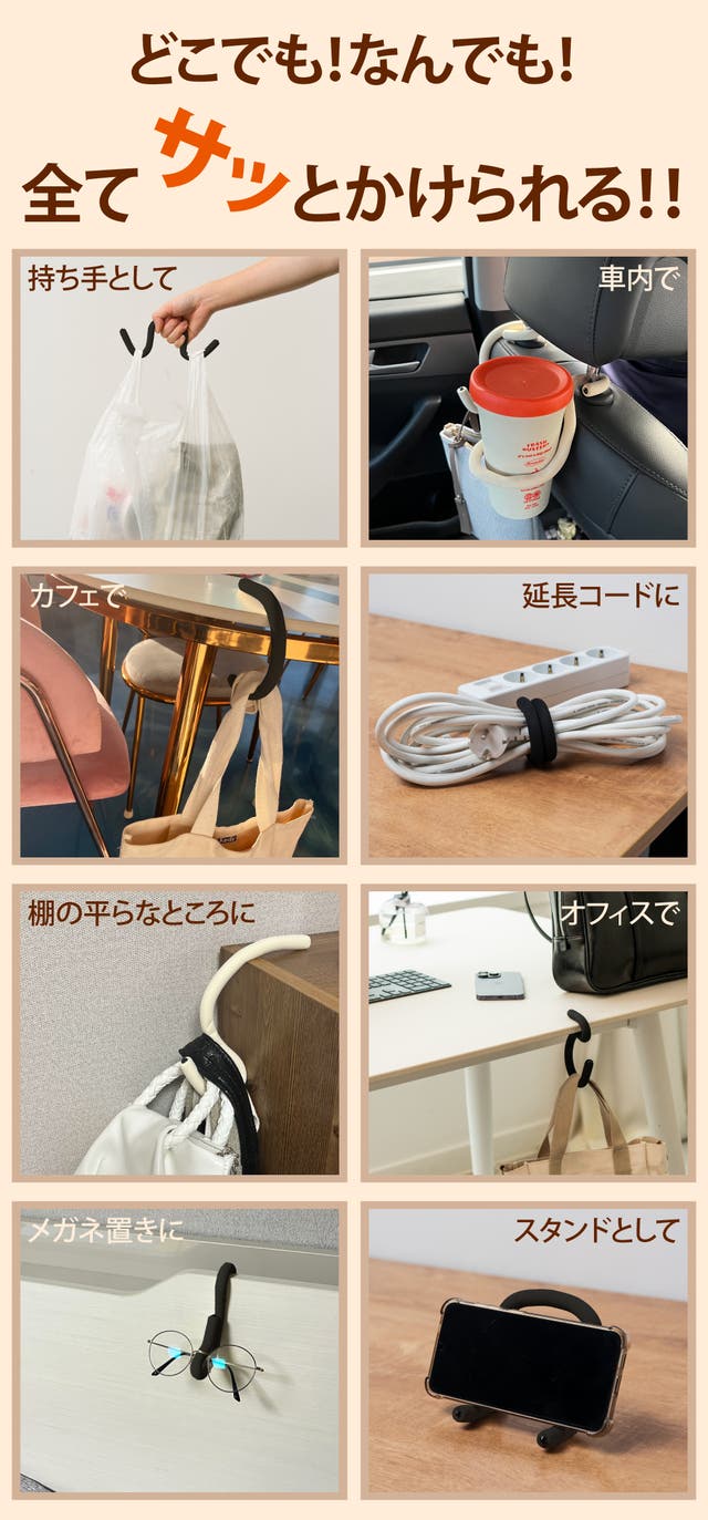 - 机・柱・オフィス・車に!スマホスタンドとしての使用や延長コードの整理など多方面で大活躍!!