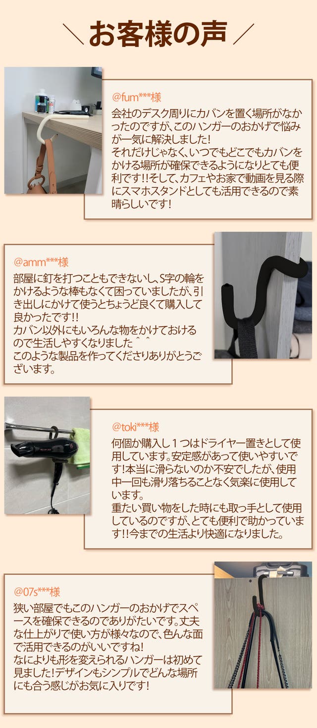 S字フックは変形不可能で掛けれる所、場所、モノが限られますがこのノンスリップハンガーはそんなことありません! 釘や接着剤を付けなくても、狭い部屋やひっかけるところがなくても大丈夫! S字フックで掛けることのできない平らなところにも簡単に掛けられます。